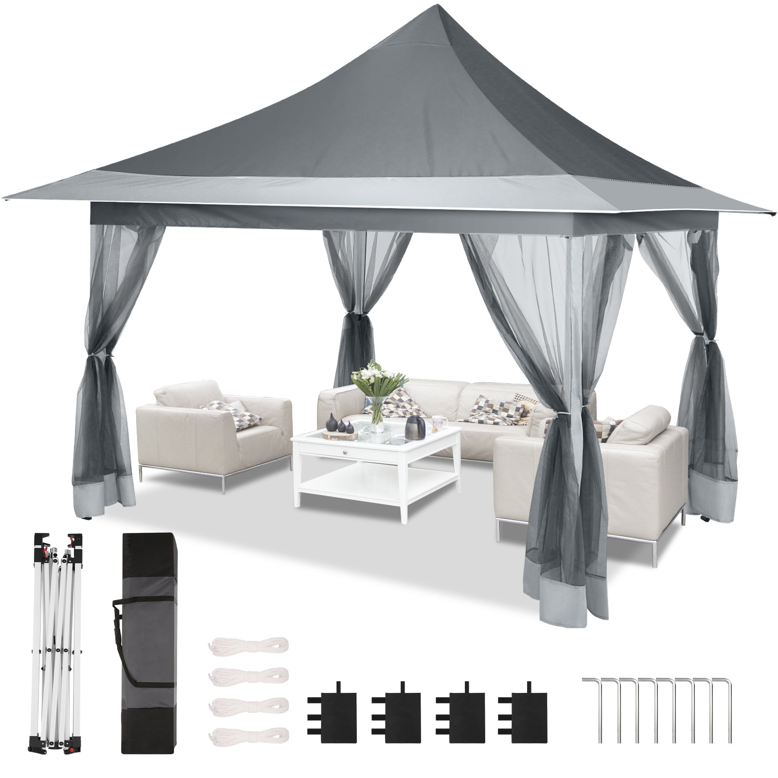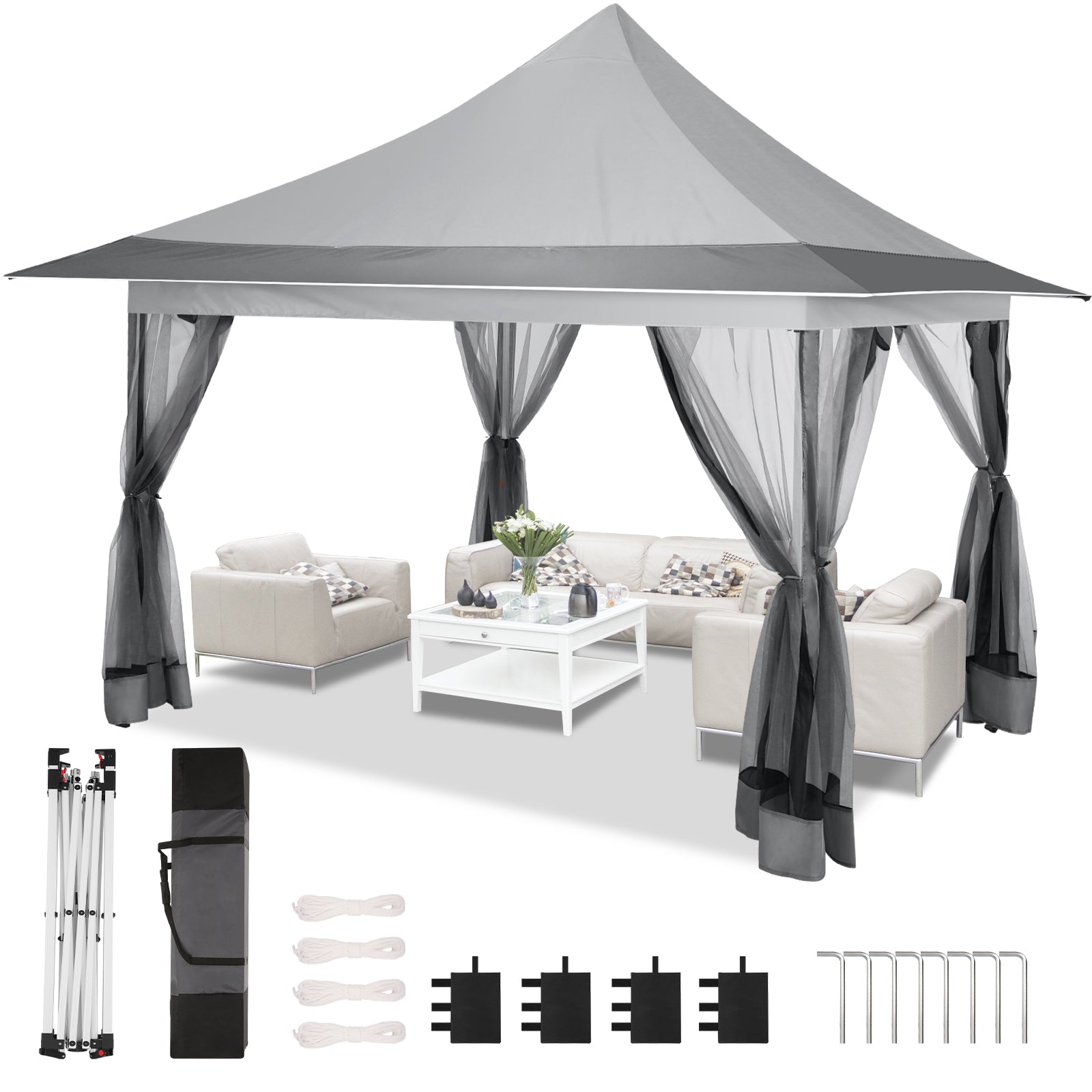 【Sturdy Steel Frame】Provides a larger shading area and stronger wind resistance. The outdoor gazebo's steel frame undergoes pickling and phosphating processes to prevent corrosion and rust. The durable powder-coated steel frame supports up to 150 lbs, and pre-drilled base and stakes increase stability and wind resistance.