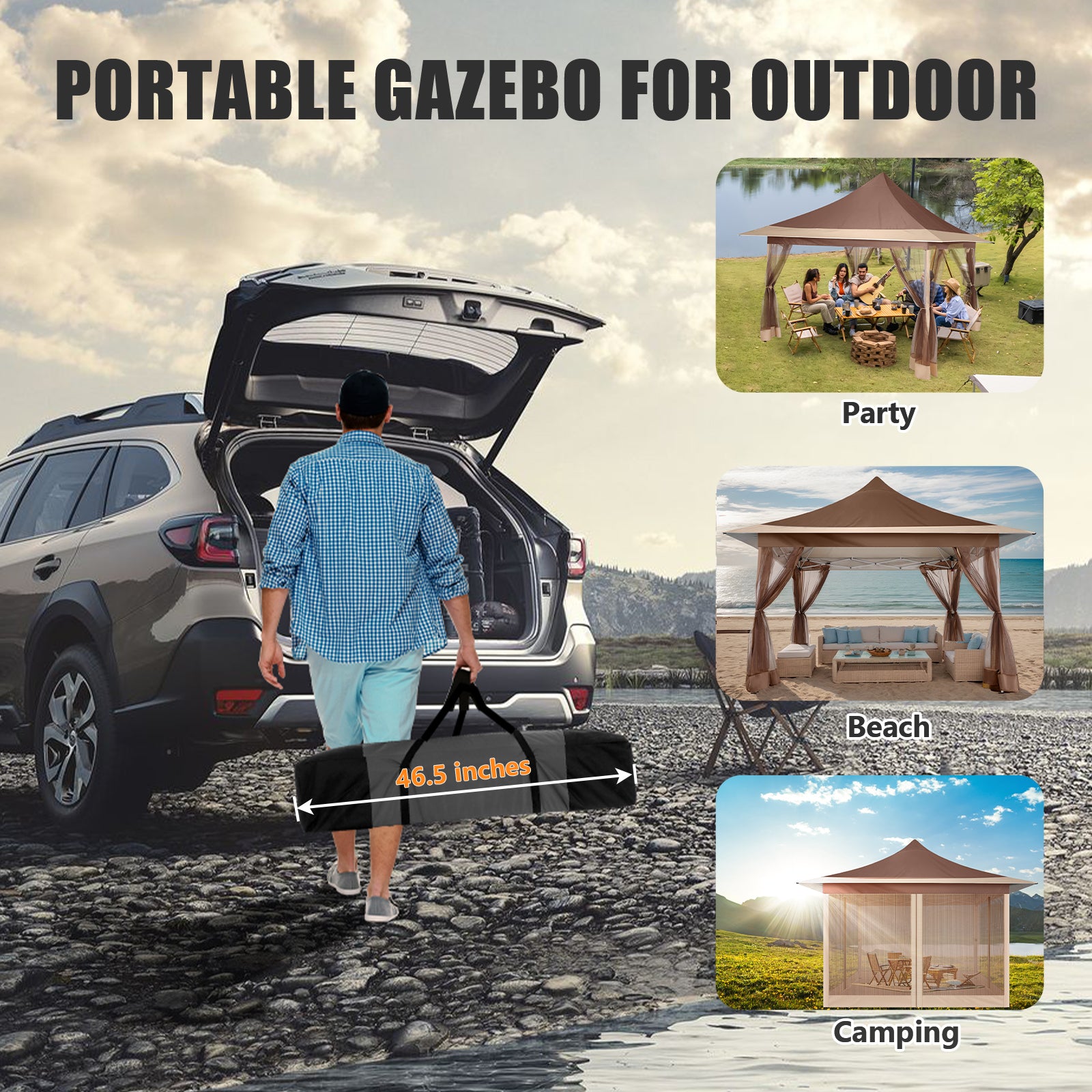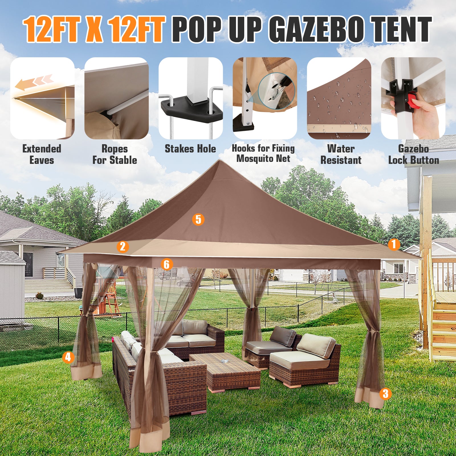 【Multiple Applications】 Measuring 12'x 12'the gazebo provides ample space for 8-10 people, is suitable for all weather conditions, and features durable fabric and sturdy metal construction, making it perfect for barbecues, camping, festivals, tailgating events, backyard activities, and more. Gazebo meets all your outdoor activity needs!