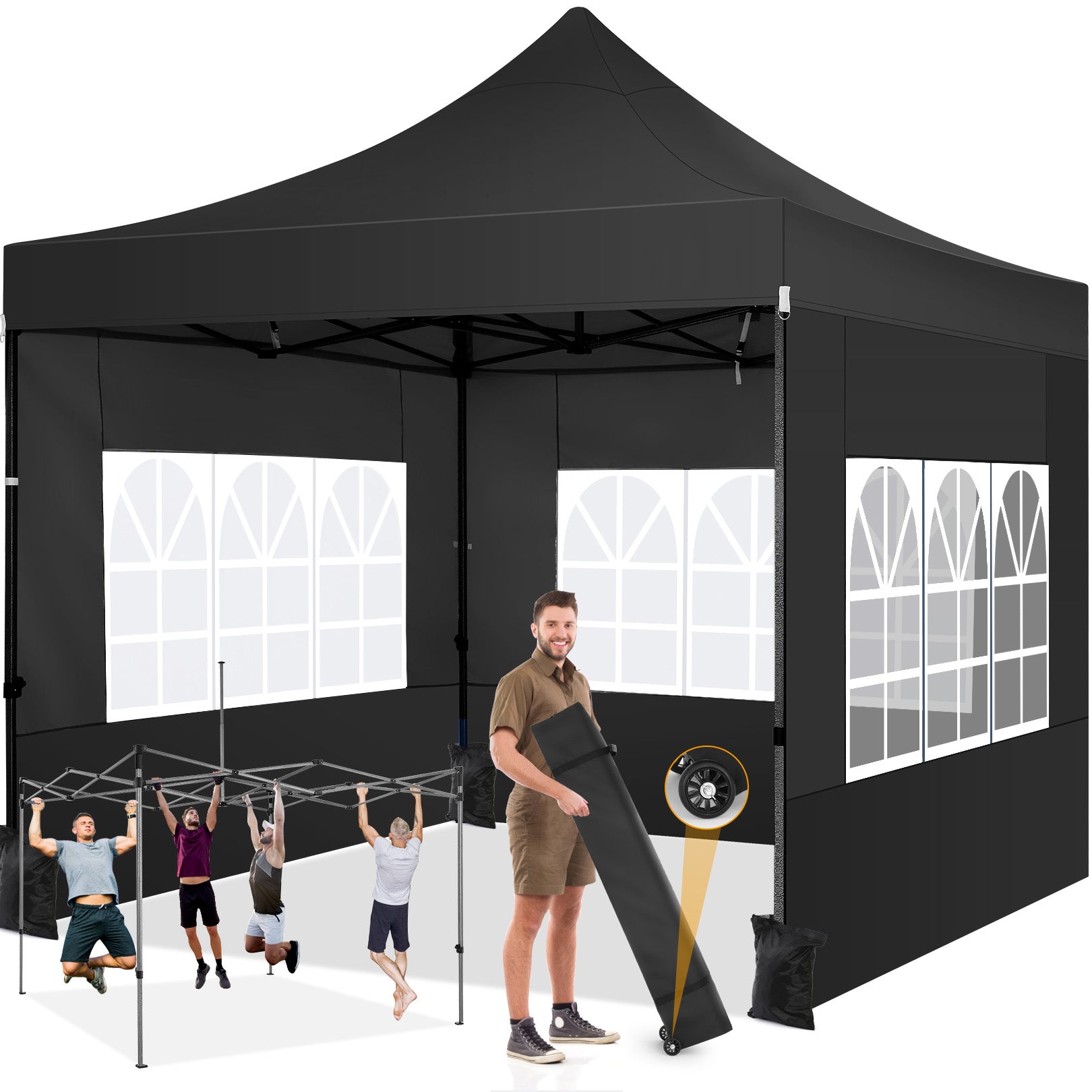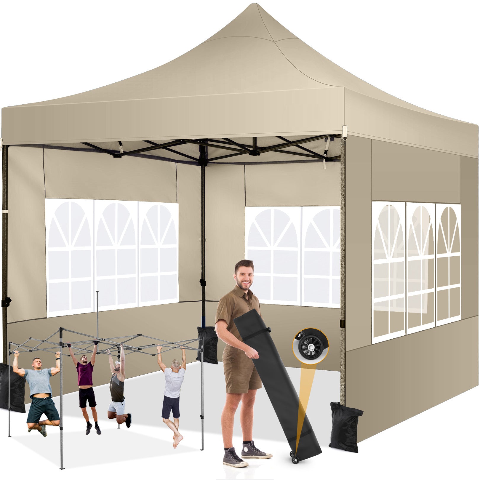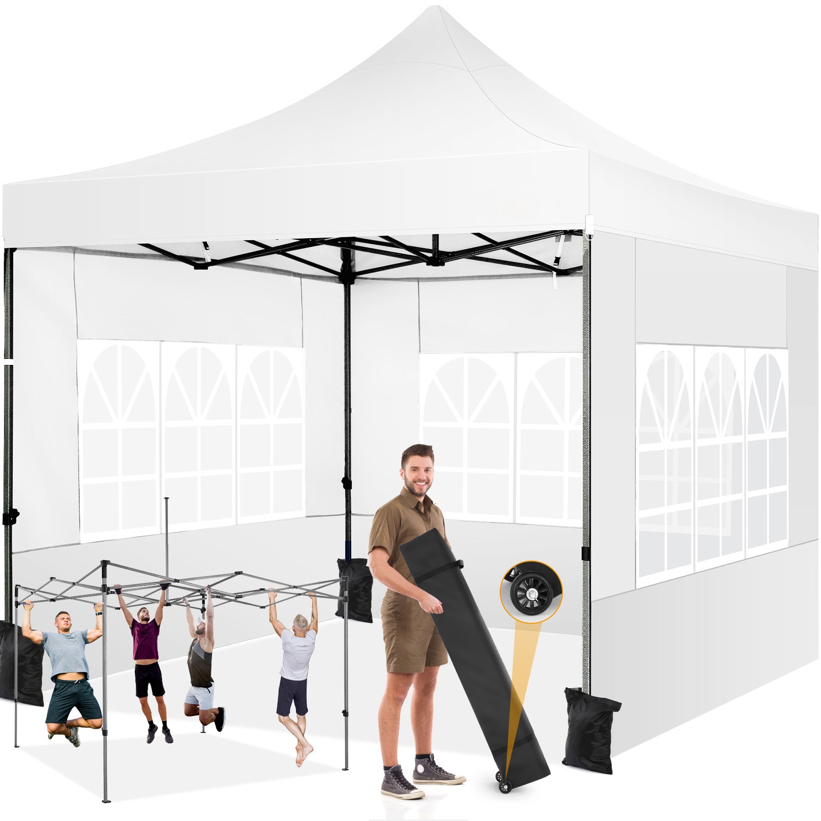 【Upgrade Heavy Duty Frame】10x10 commercial canopy frame is full truss construction with powder coated, durable and rustproof. The pipe diameter is 1.26'' and the wall thickness is 0.03'', while most common tents are only 0.98'' in pipe diameter and only 0.02'' wall thickness. Intermediate support pole construction can hold up to 220 lbs on a single pole and can withstand up to level 4 wind/18 mph, using the included sandbags, ropes and nails to increase the stability of the wedding tent gazebo.