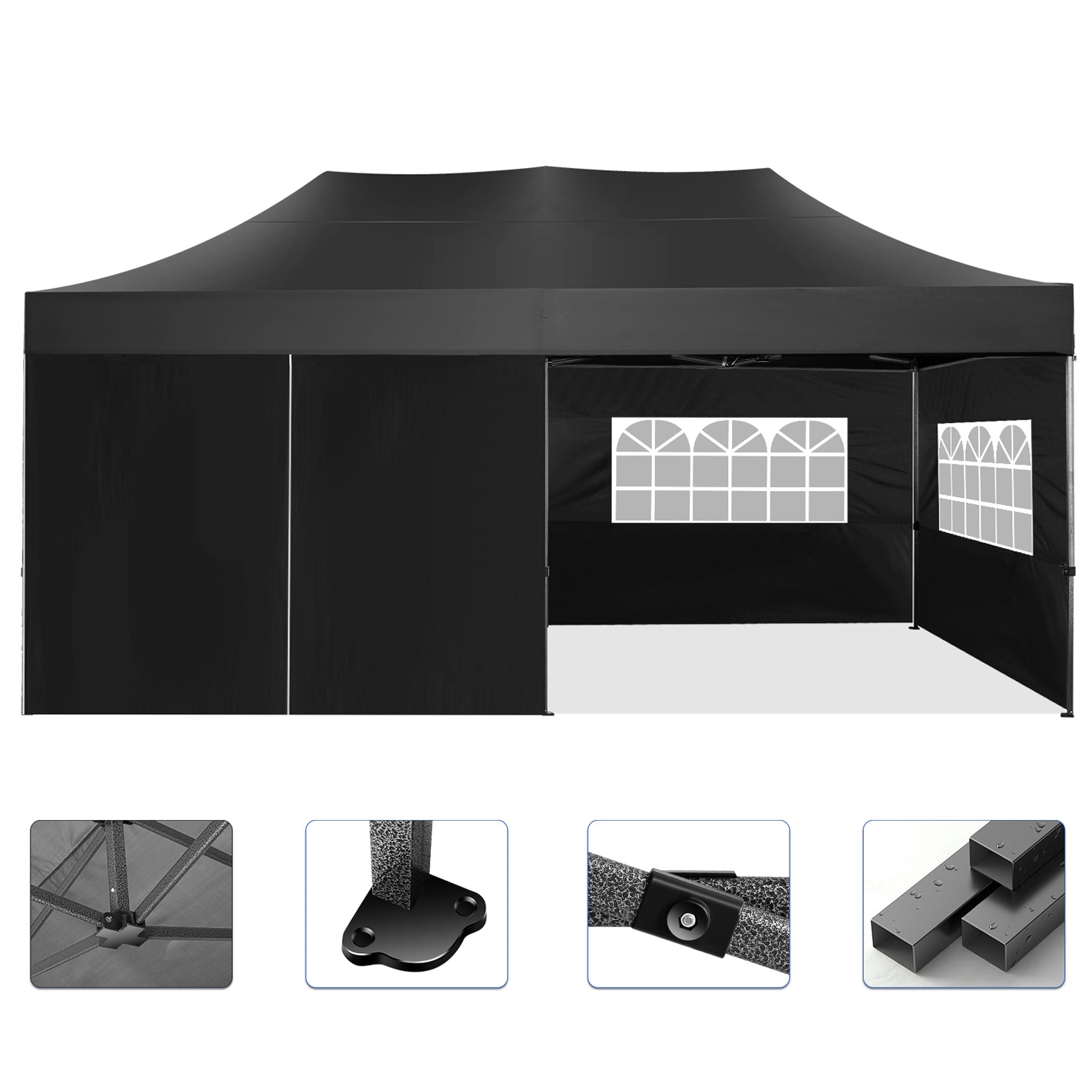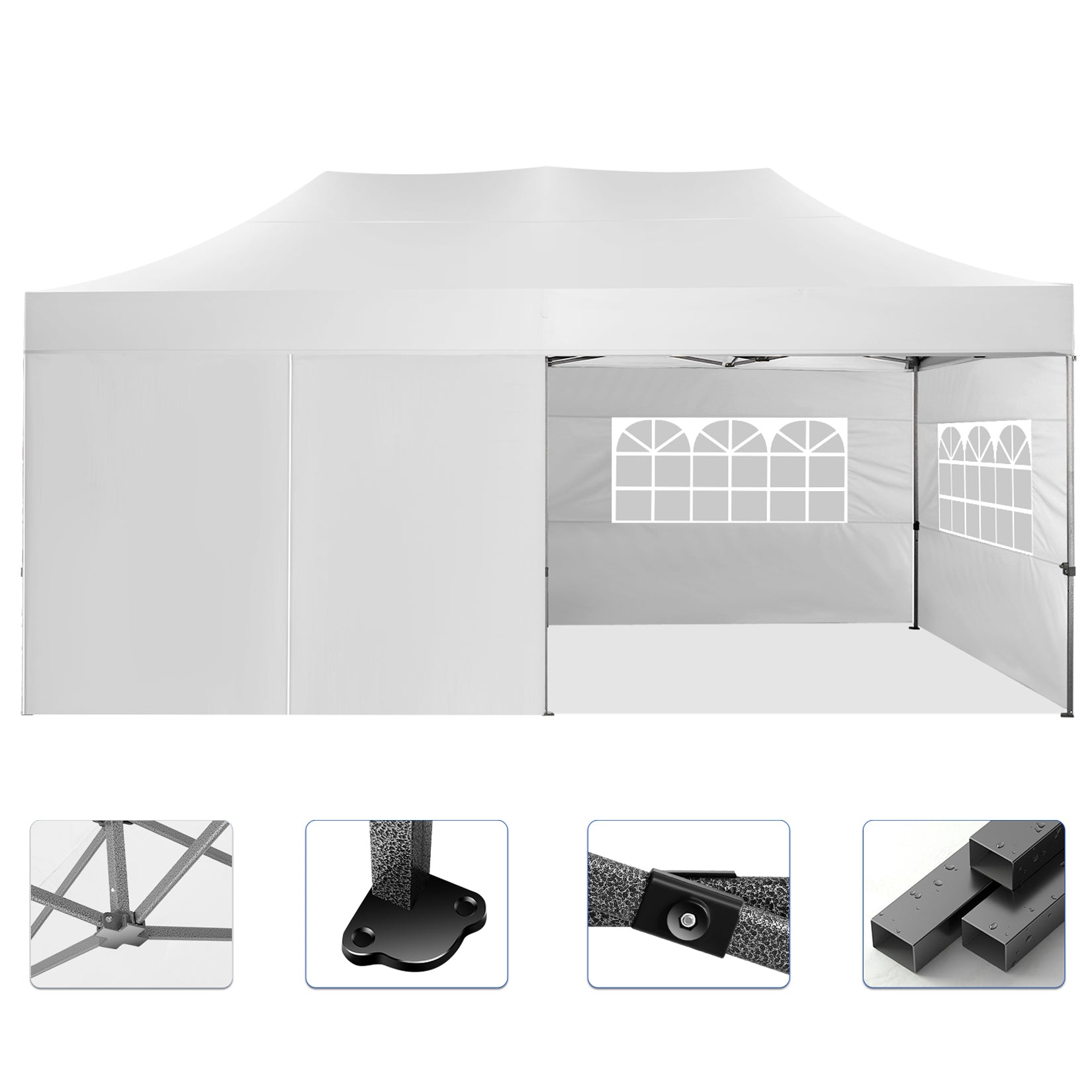 10x20 commercial canopy frame is full truss construction with powder coated, durable and rustproof. Party tent is made of 420D high quality Oxford with two layers of PU coating, UPF 50+, blocks 99% of the sun's rays. Seams are fully sealed to prevent water leakage, 100% waterproof. 6 PU coated removable sidewalls are connected by a whole strip of Velcro and zipper for tying frame top and legs. You can install different number of sidewalls according to your needs.Upgraded strong wheels and reinforced handle, easy to move and transport. Tents for parties, weddings, barbecues, trade shows, sporting events, disaster relief or other outdoor events. Perfect for commercial areas, playgrounds, yards, beaches, farms, gyms and more.