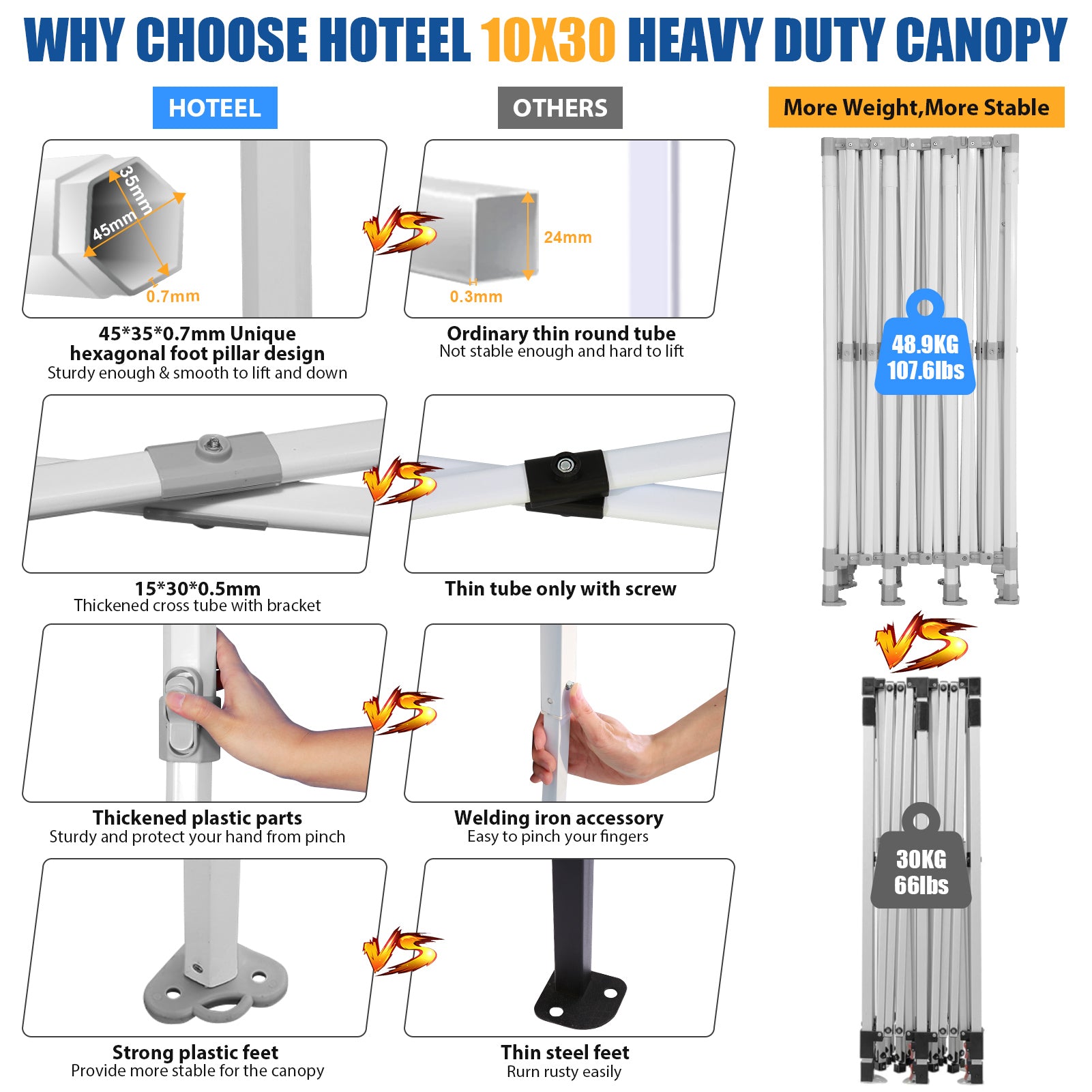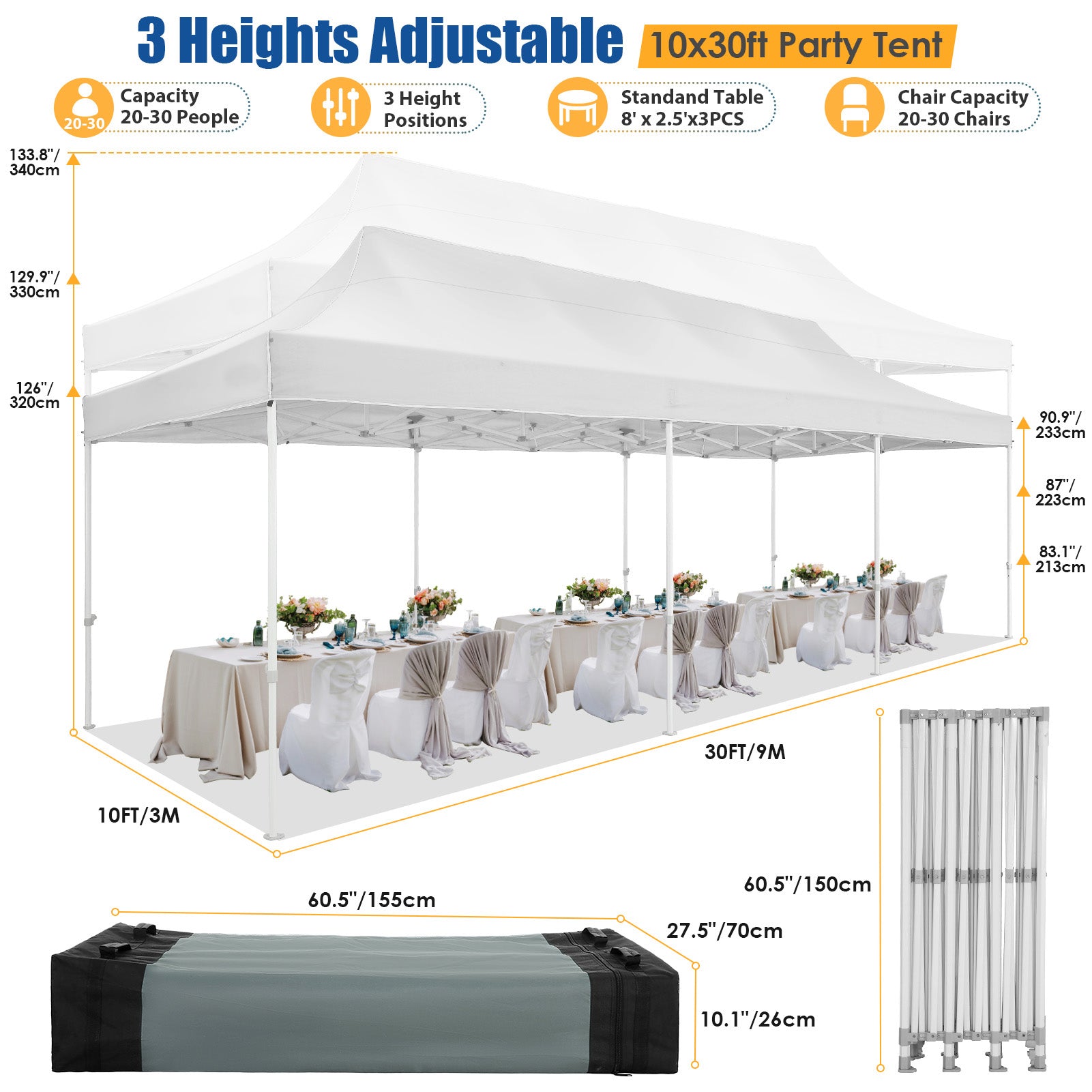 【Large Space】The Heyhotel 10x30ft pop-up awning offers a spacious 600 square feet of coverage and 3 adjustable heights, easily accommodating 25-30 people to meet your various needs for large parties.