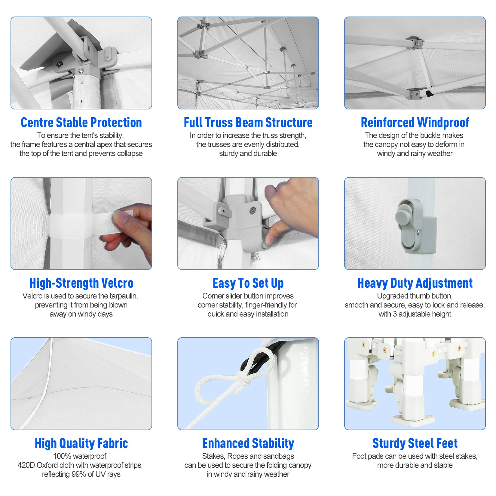 【Premium Fabric】 The ultra-durable pop-up awning is made of 420D Oxford cloth with a PVC coating and waterproof strips, ensuring 99% UV protection and 1500mm water resistance, keeping it cooler in the shade. Even with a 42-inch height difference, the fabric remains tightly packed, effectively reducing water accumulation.