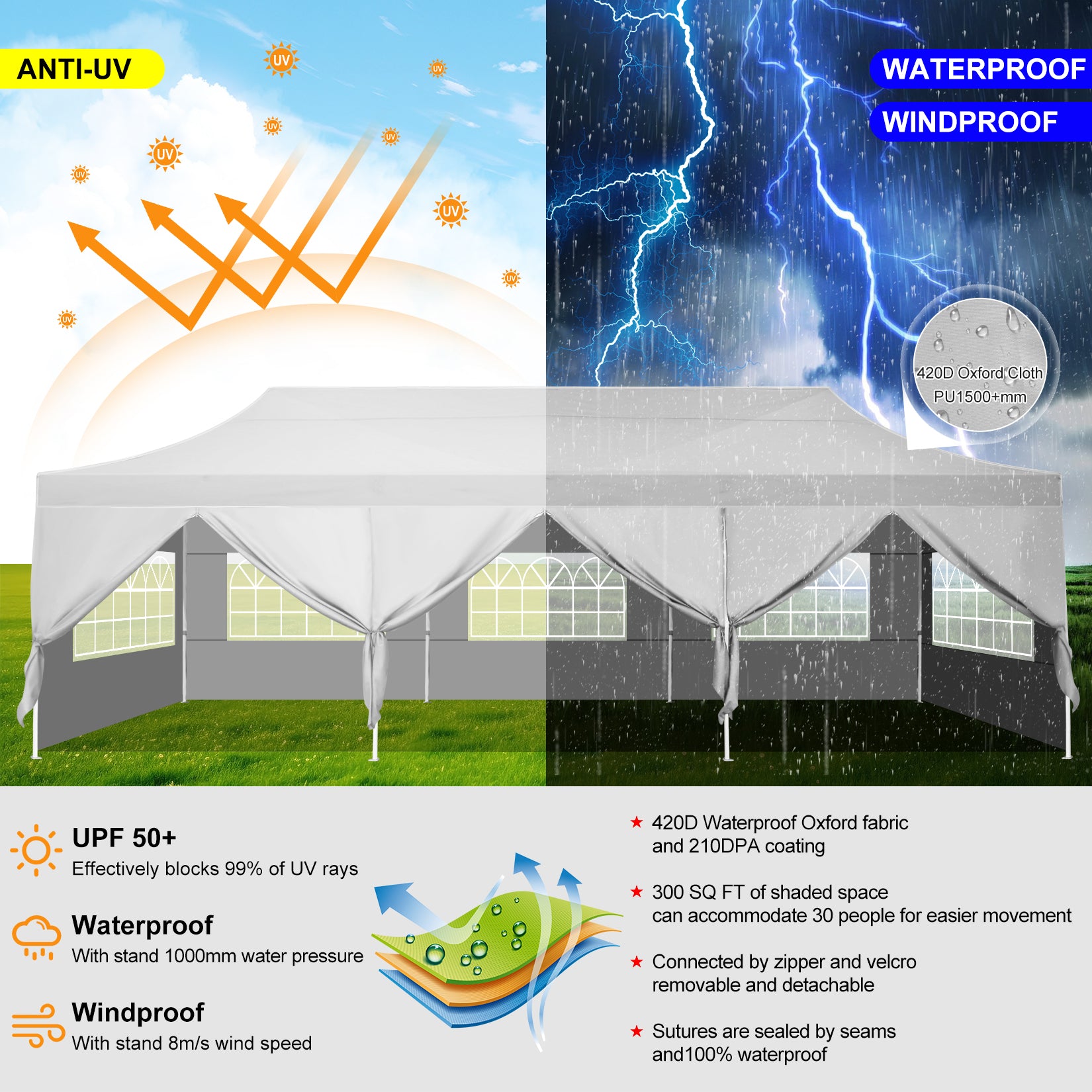 【Easy Assembly】The 10x30 ft tent can be easily set up in 3-4 minutes without additional tools. It comes with a portable 600D Oxford cloth bag for easy transport and storage, making it ideal for outdoor use.