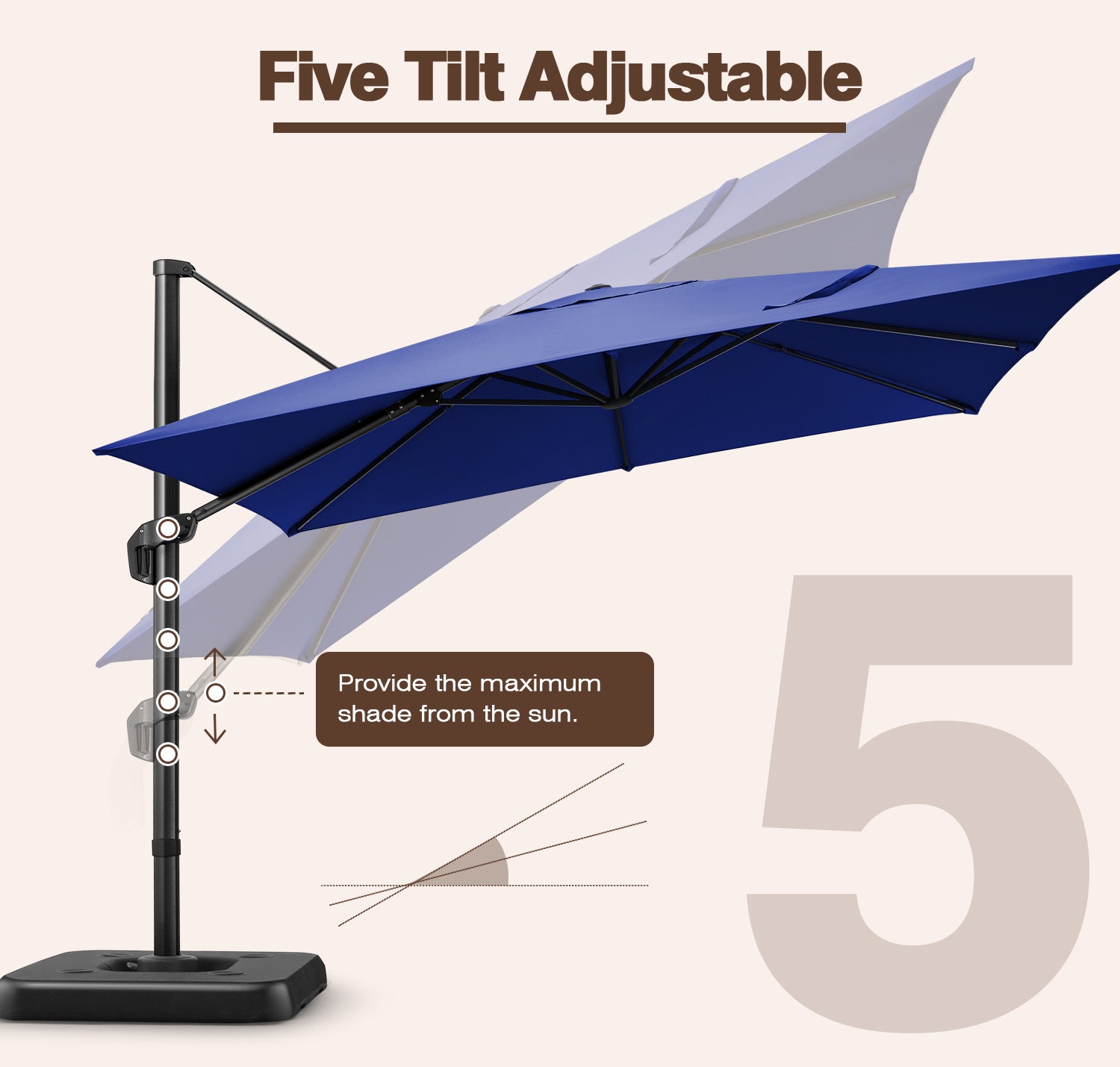 ✨Adjectable Shade——The crank system of this cantilever umbrella makes it easy to raise and lower the canopy, Five-speed adjustment of the height of the handle on the column. the unique handle design also makes tilting the umbrella effortless, foot pedal allows for complete 360 degree rotation