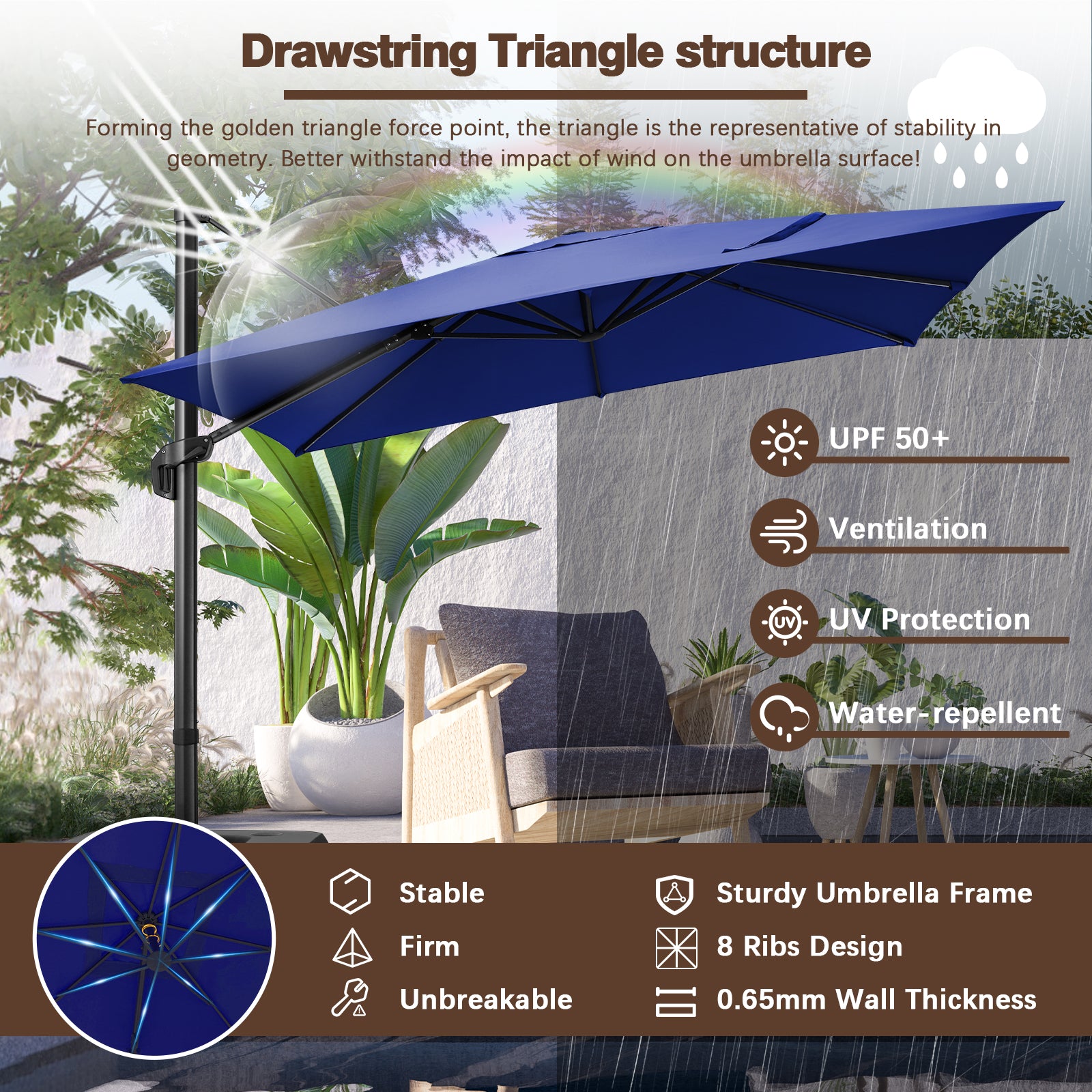 ✨High Stability——Outdoor cantilever umbrella includes cross base; and keep your umbrella in place,All-aluminum umbrella bones and 8 heavy-duty ribs, anti-oxidation spray painted, maintain a long period life