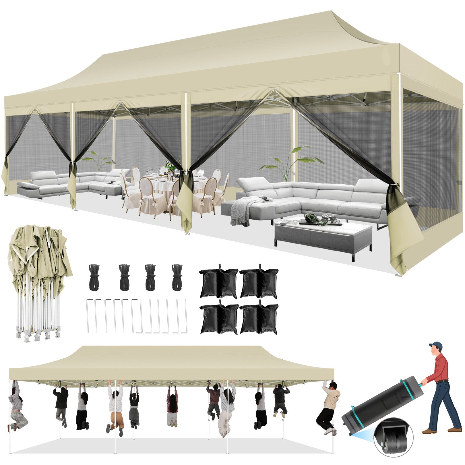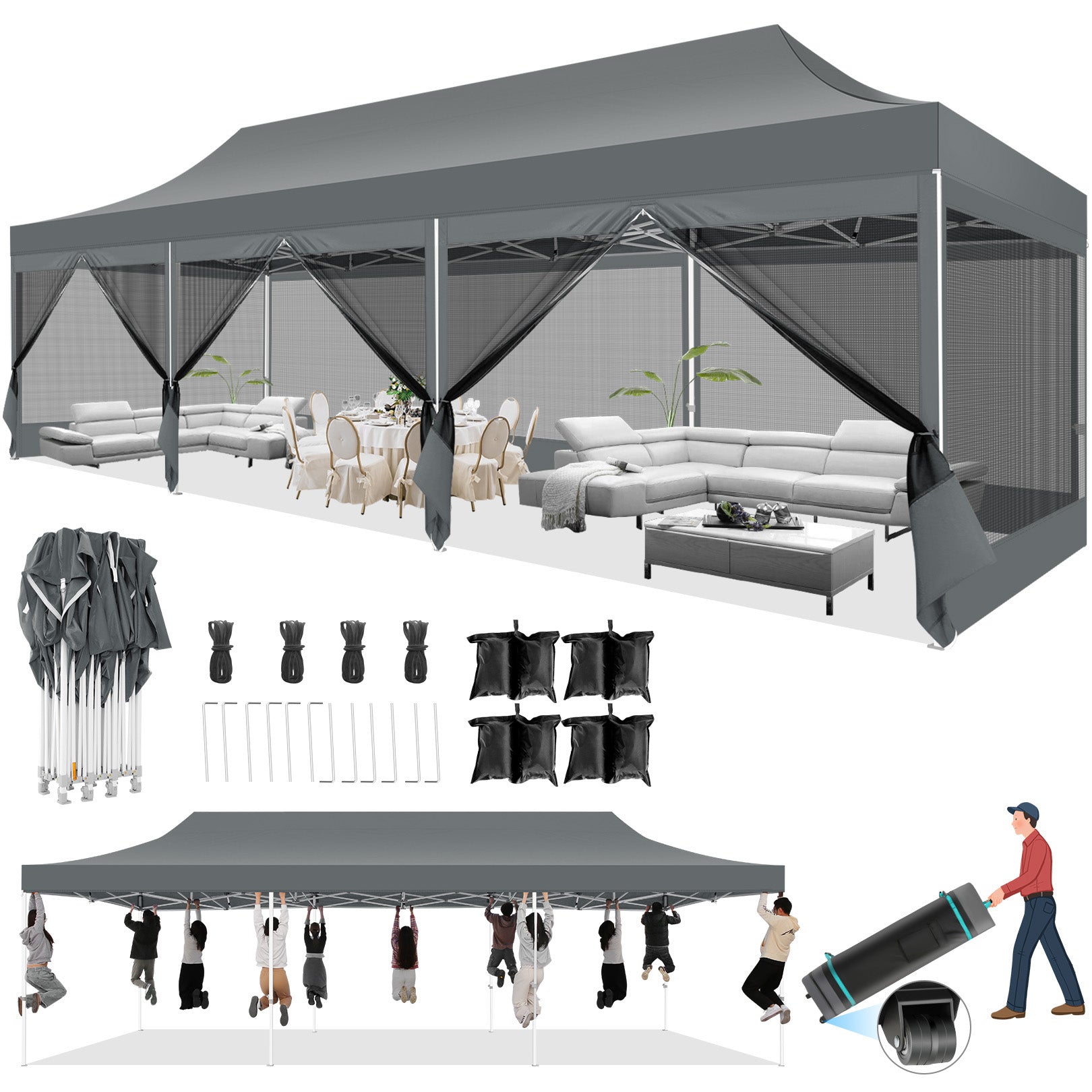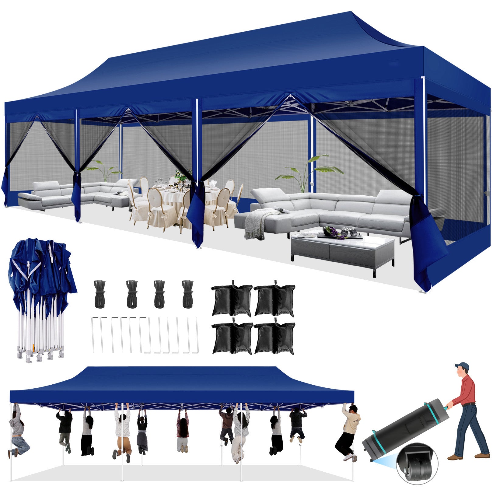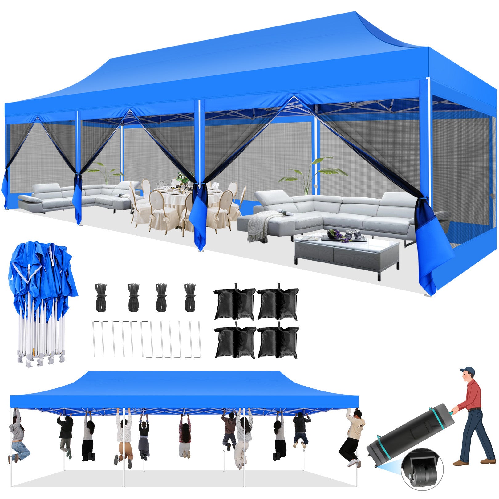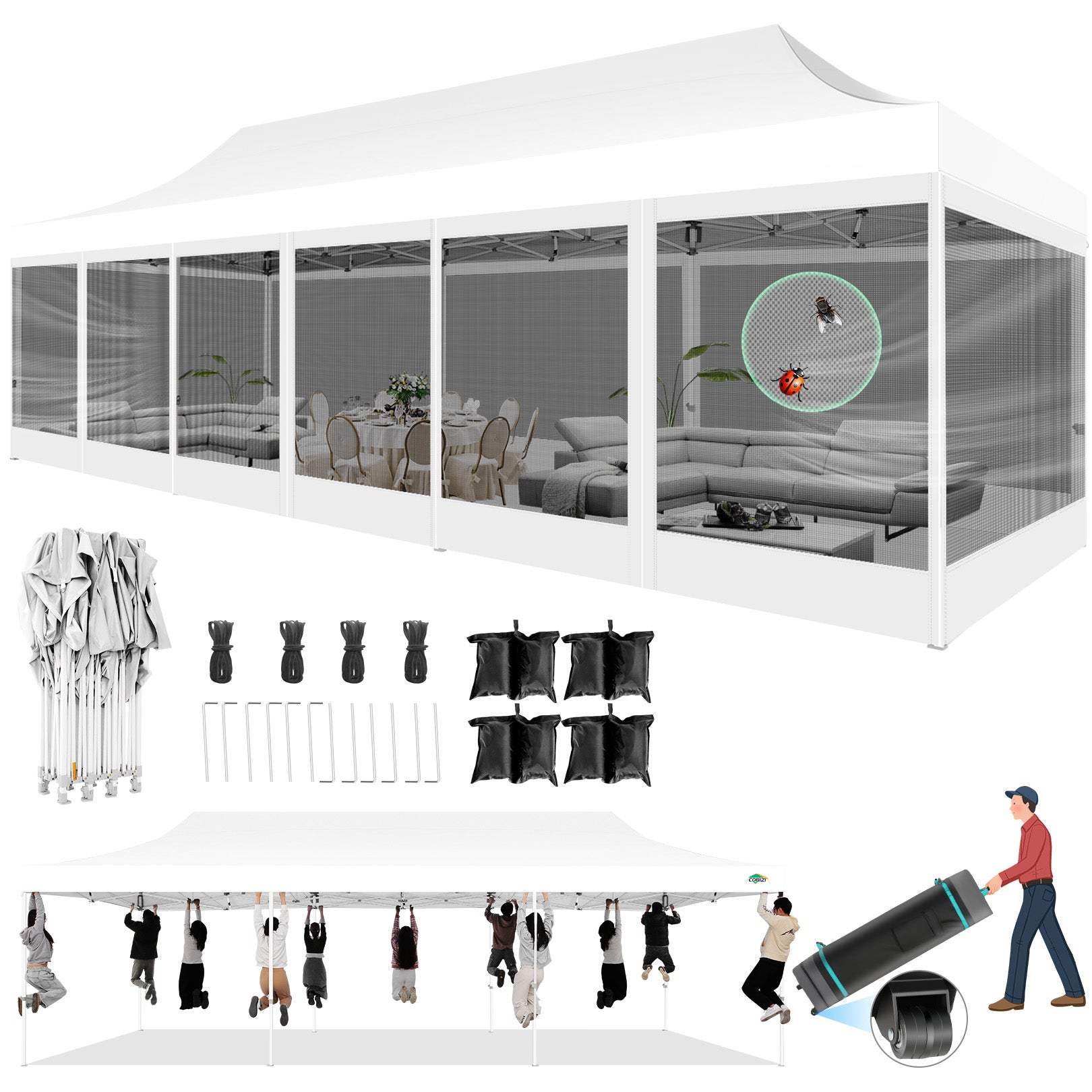 【UV & Waterproof & Mosquito Nettings】 10'x30' outdoor pop up gazebo is made from reliable 420D Oxford Fabric, flame retardant, UPF 50+, waterproof and blocks 99% of UV rays; Our pop up tent features 8 mesh side walls that provide clear visibility, plenty of light and ventilation. The 360° Velcro are 100% sealed, keep bugs out.The double-head zipper on each side of the commercial canopy tent mesh can be pulled inside and outside, which is convenient for entering and exiting outdoor gazebo.