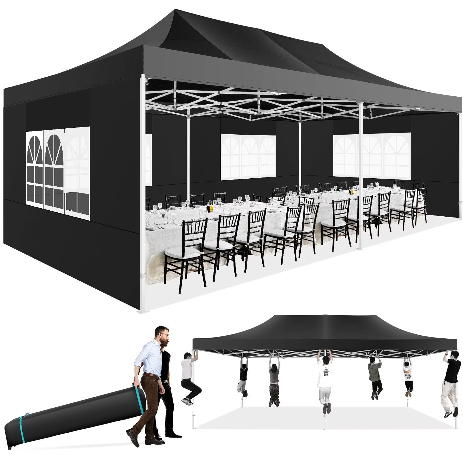 🤝【Versatile & Convenient】This pop-up canopy is great for parties, weddings, backyards, barbecues, market stalls, flea markets, disaster areas, and more. It includes 8 side panels, 3 with zippers for easy access, and 5 with windows to keep children and pets within sight during camping.