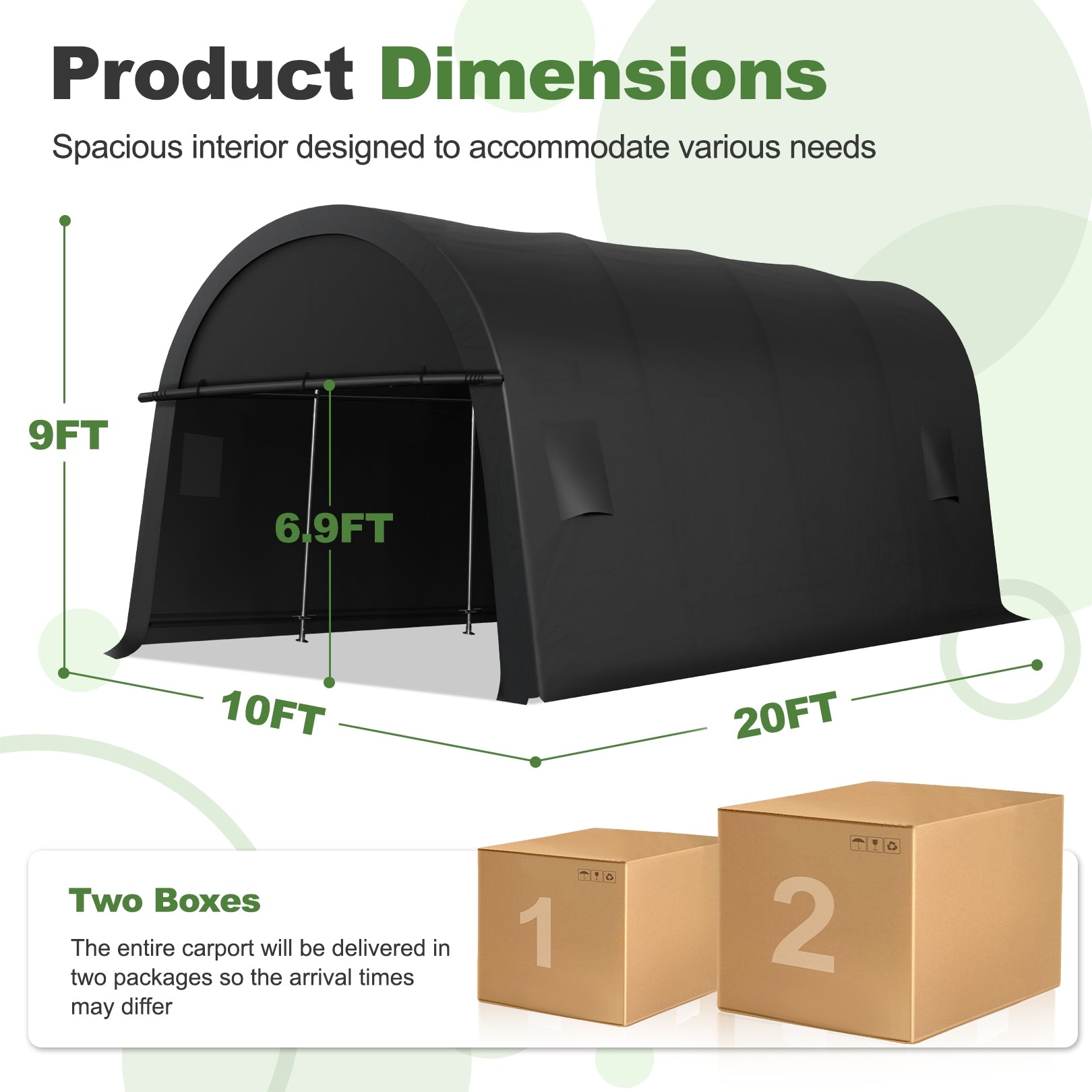 【Spacious Interior & Multi-Purpose Heavy-Duty Carport】The dome roof design of our 10x20 carport canopy tent offers more interior space compared to a traditional peaked roof. Our garage storage is perfect for keeping various items outdoors clean and dry. It's perfect for storing gardening tools, lawn equipment, or materials needed for outdoor projects like construction.